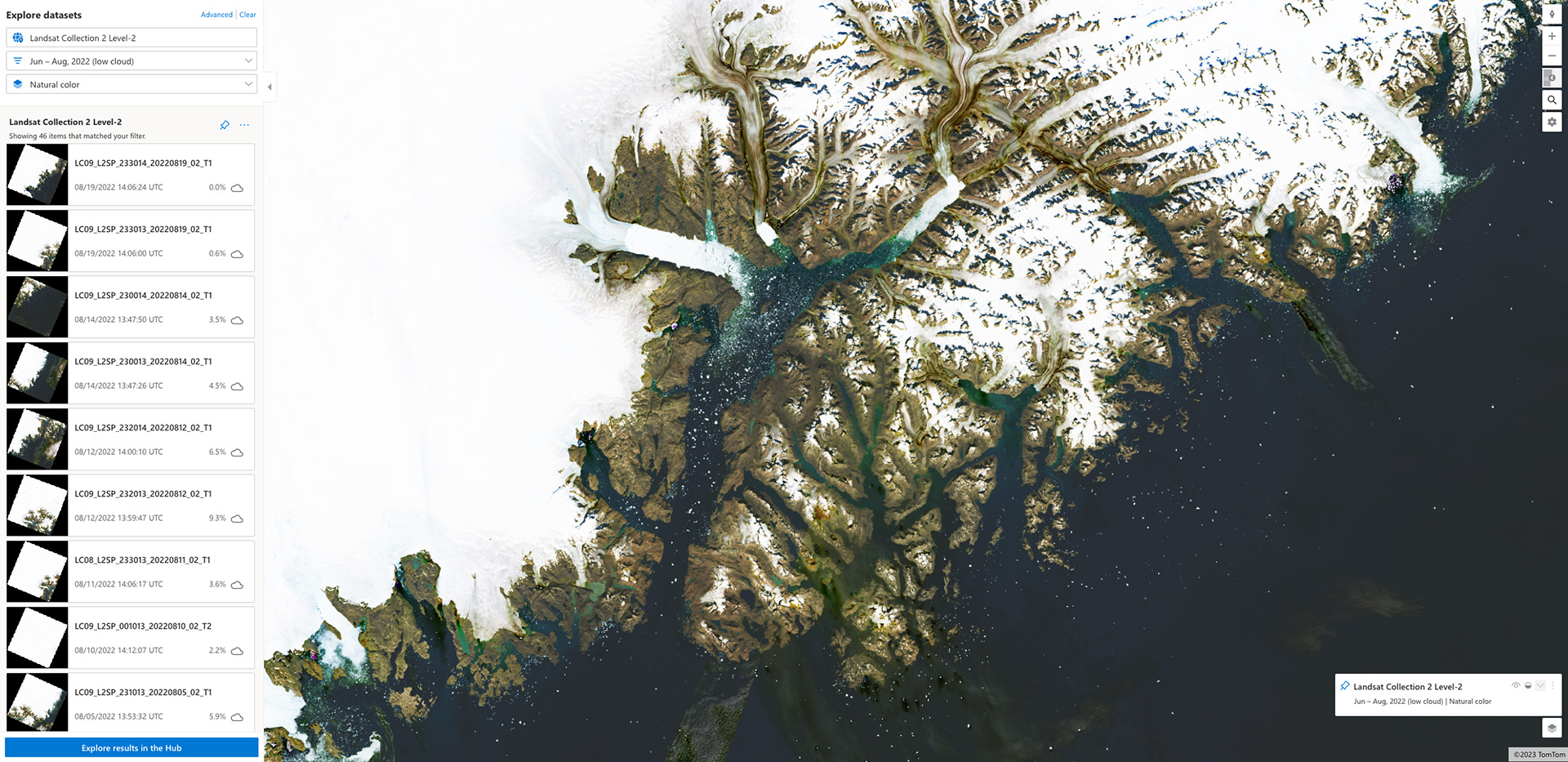 In this screenshot, you can see Landsat level 2 data loaded over the Helheim Glacier in southeast Greenland. In the left sidebar, you can see that we are visualizing only low-cloud cover scenes over a specific time period, and these scenes are being mosaiced together with our tiler. The query parameters in the left drop down are converted under the hood into HTTP request parameters, which have been used to query the STAC API to discover the assets available for our view window.