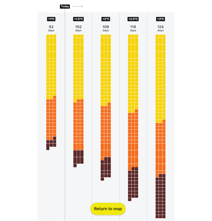 Initially, the UX team had ranked counties by the increase in wet-bulb temperature, a measure used to determine heat stress for humans. This proved to be less effective and ultimately °F/°C temperature was used instead. There are two noteworthy, playful design choices. First, when you select a location you see heat days in a chart inspired by Google calendar sheets. This was a choice to represent hot days in a non-traditional way instead of using, for example, a line chart. Second, some of the elements on the page are rotated by 1°, 1.5°, or 2°. The visual design picks up on the temperature changes that come up in many climate change conversations.