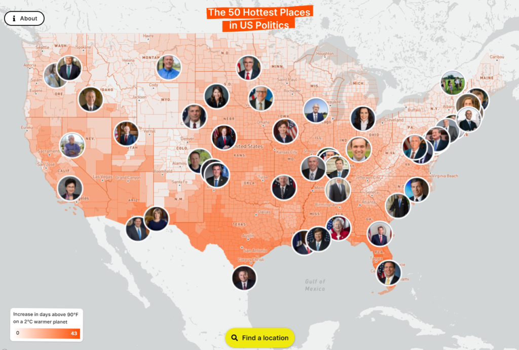 Our UX team approached this project by thinking about how to present climate warming information in a way that drives action. After various brainstorms and design sessions, the team decided that adding political boundaries and matching those with elected officials would create an interactive visualization that could be used as an advocacy tool to demand action. To do this they aggregated local warming effects by political boundaries (counties) and ranked those counties by warming severity. We then layered in Cicero, Azavea’s in-house legislative district and elected officials database. Now the user could see the alarming data on climate warming but also be empowered to reach out to their local elected official to demand action.