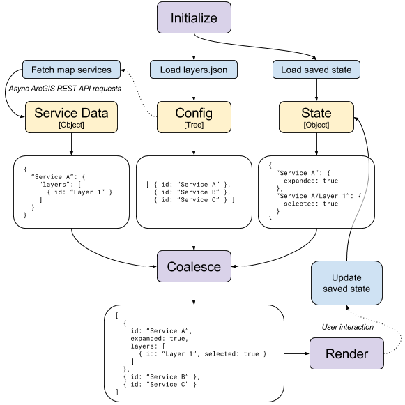 Map services in the layer selector are represented by an immutable tree structure, populated from a static JSON configuration file. State generated from user interactions (such as activating layers, applying a search filter, etc.) is maintained in a separate immutable structure. Map services data is requested upon initialization, based on the JSON configuration, and is maintained in a dedicated cache. Every time a new piece of information is received, all input sources are combined, and used to redraw the layer selector.