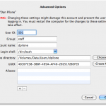 Now that you’re logged in as a new administrator you can sort out your old home directory. I renamed my old Macintosh HD to be Data before going any further. This means I now have my old 650GB (with all of the original data) mounted on /Volumes/Data. Now comes the cool part. Snow Leopard uses directory services (OpenDirectory) to store user information, including the user’s home directory path. The trick is to find the dialog. Open up System Preferences -> Accounts and click the lock at the bottom to unlock it. Next, right click on your username and select Advanced Options. This will bring up another dialog with advanced directory settings for the account.